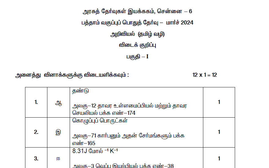 | 10th Science Public Official Answer Key 2024 Tamil Medium |