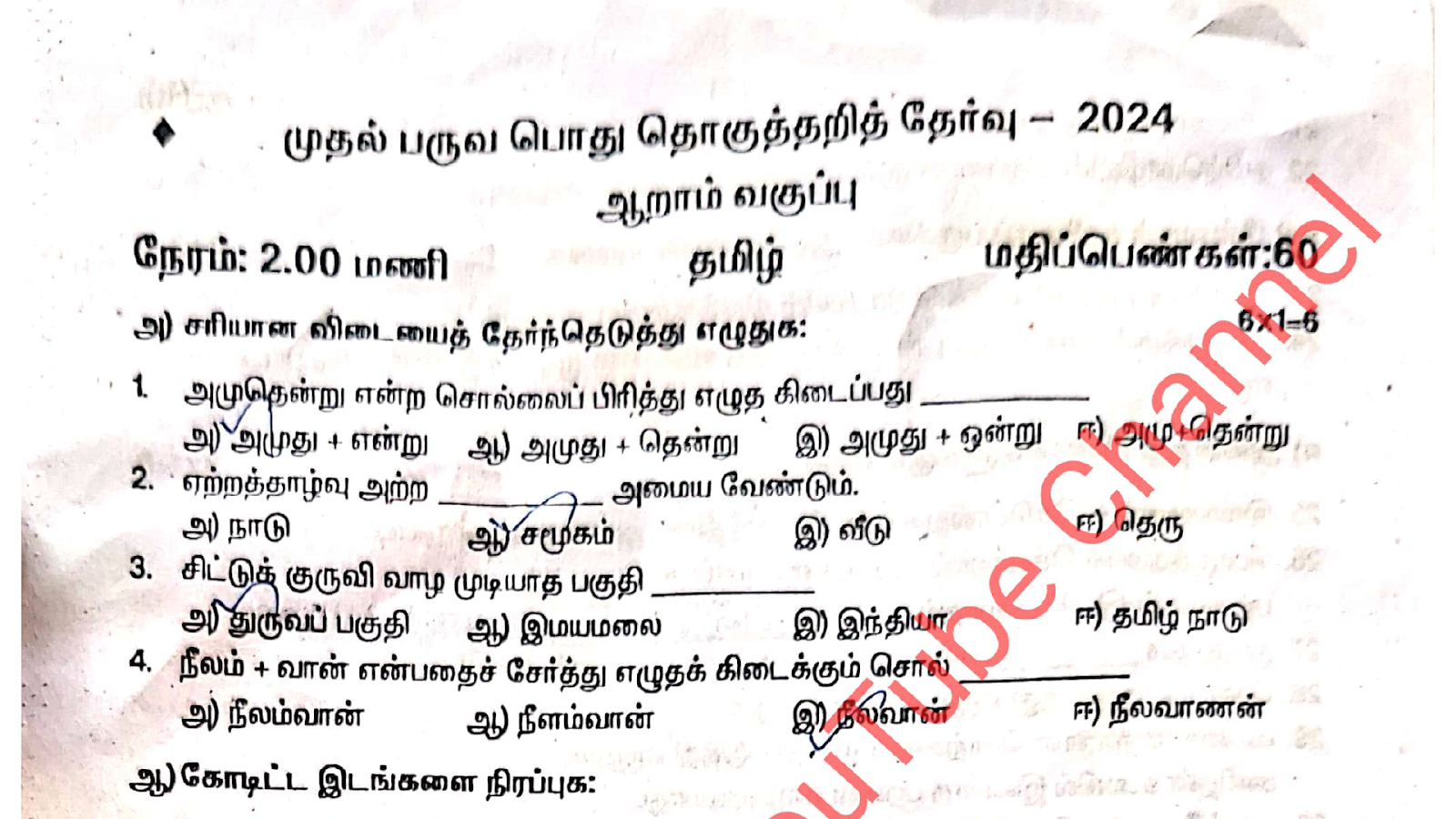 6th Tamil First Term Exam Question Paper & One Mark Answer Key 2024 Theni Dt