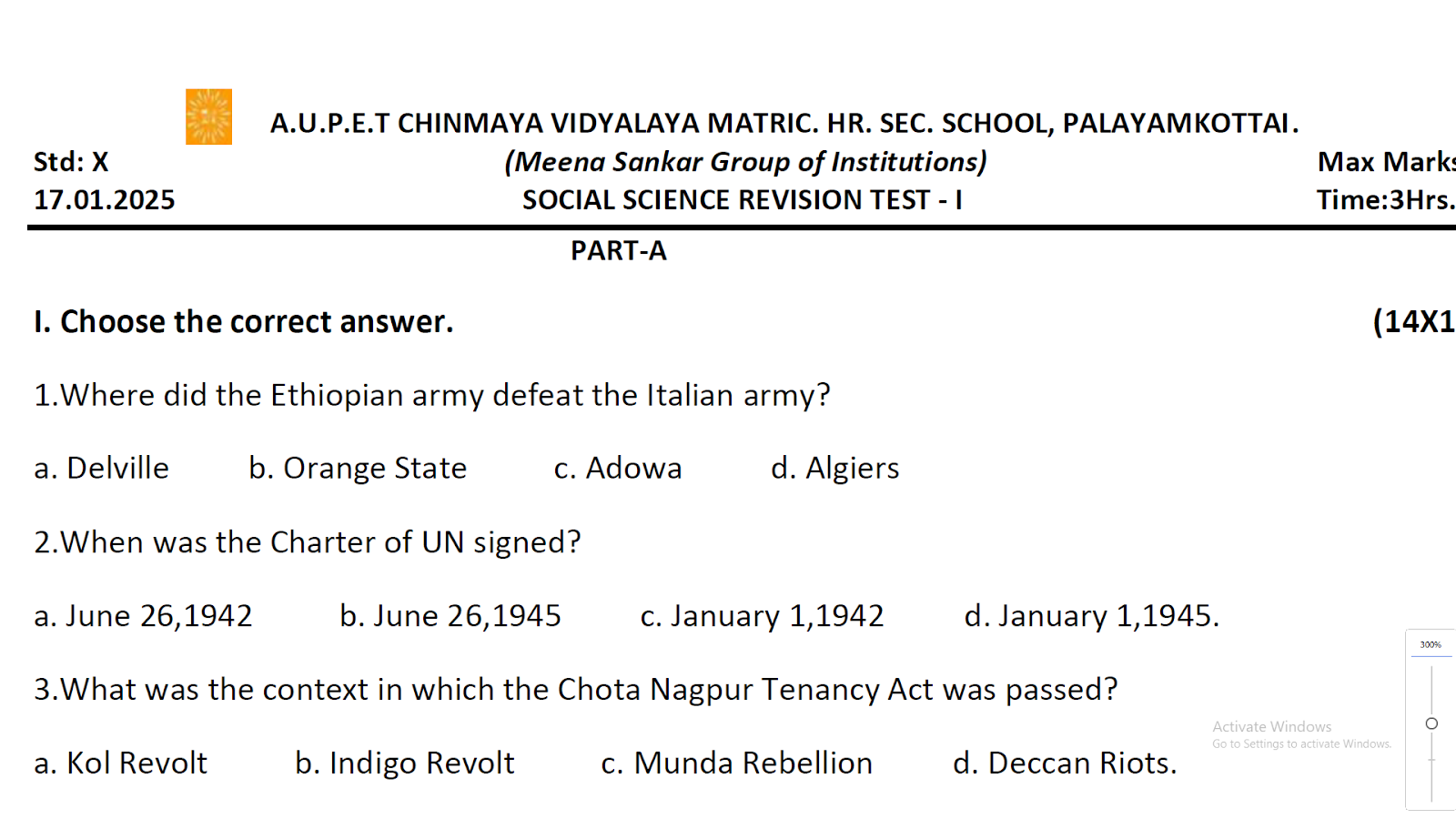10th Social Science Revision Test - 1 Question Paper English Medium 2024-25 Palayamkottai
