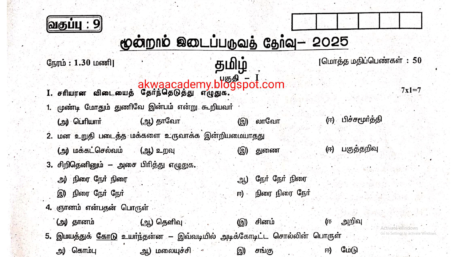 9th Tamil 2nd Mid Term Test Question Paper 2025 Erode Dt
